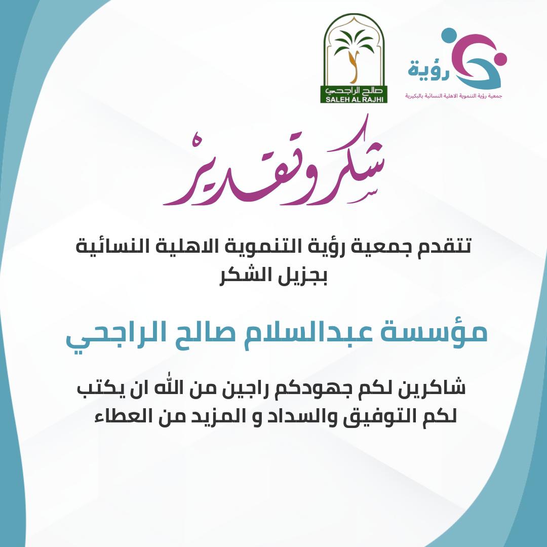 تتقدم جمعية رؤية التنموية بالشكر الجزيل لمؤسسة عبدالسلام صالح الراجحي لدعم الجمعية بعدد 200 سلة غذائية للمستفيدين.